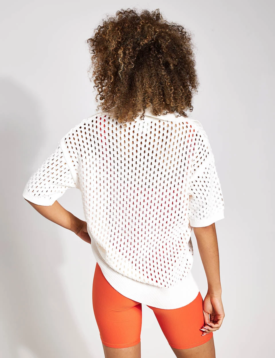 The Teagan Boxy Knit Polo is perfect for popping on over your workout gear for a casual look. It has a wide polo collar and open weave design to keep you looking and feeling cool and fresh.